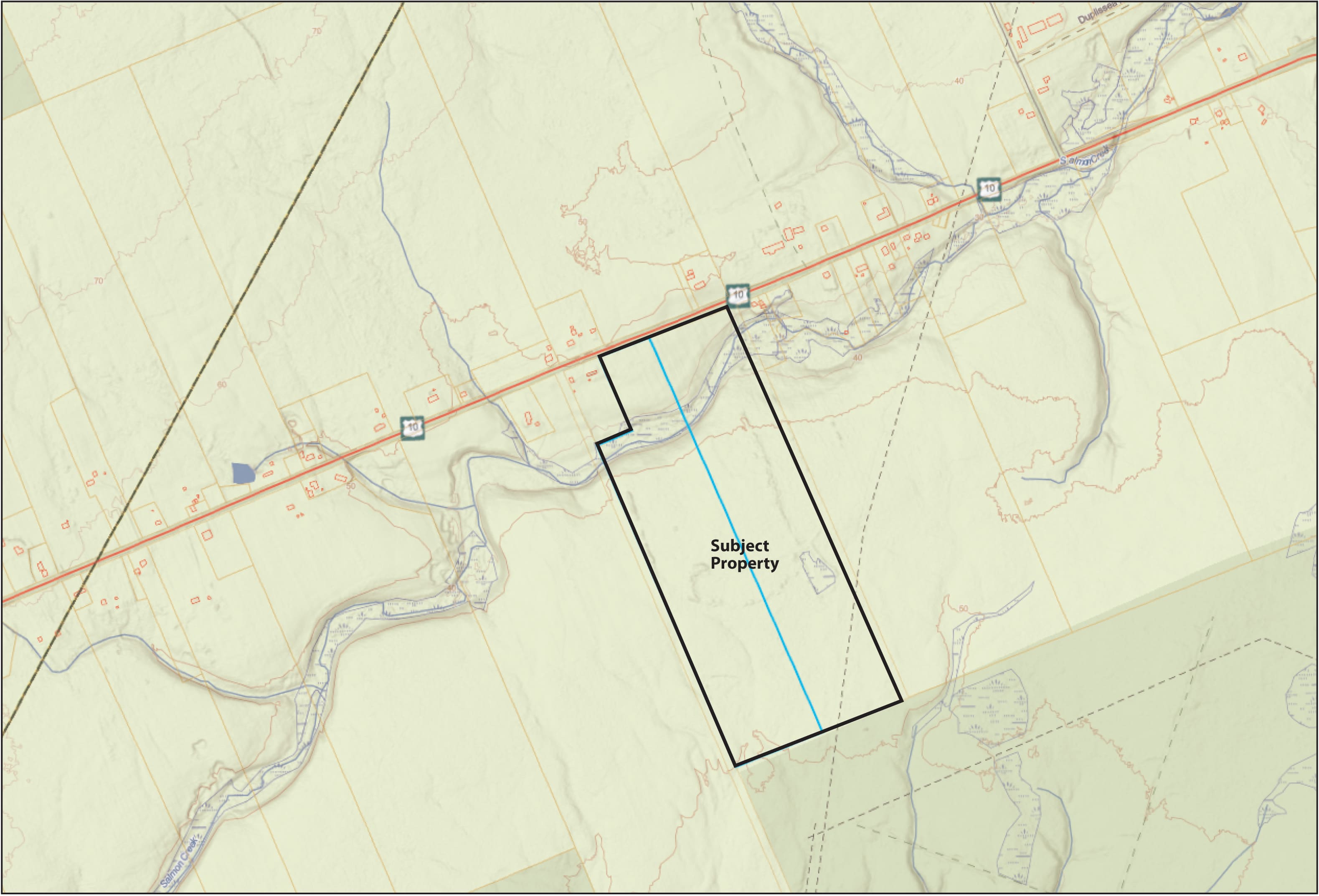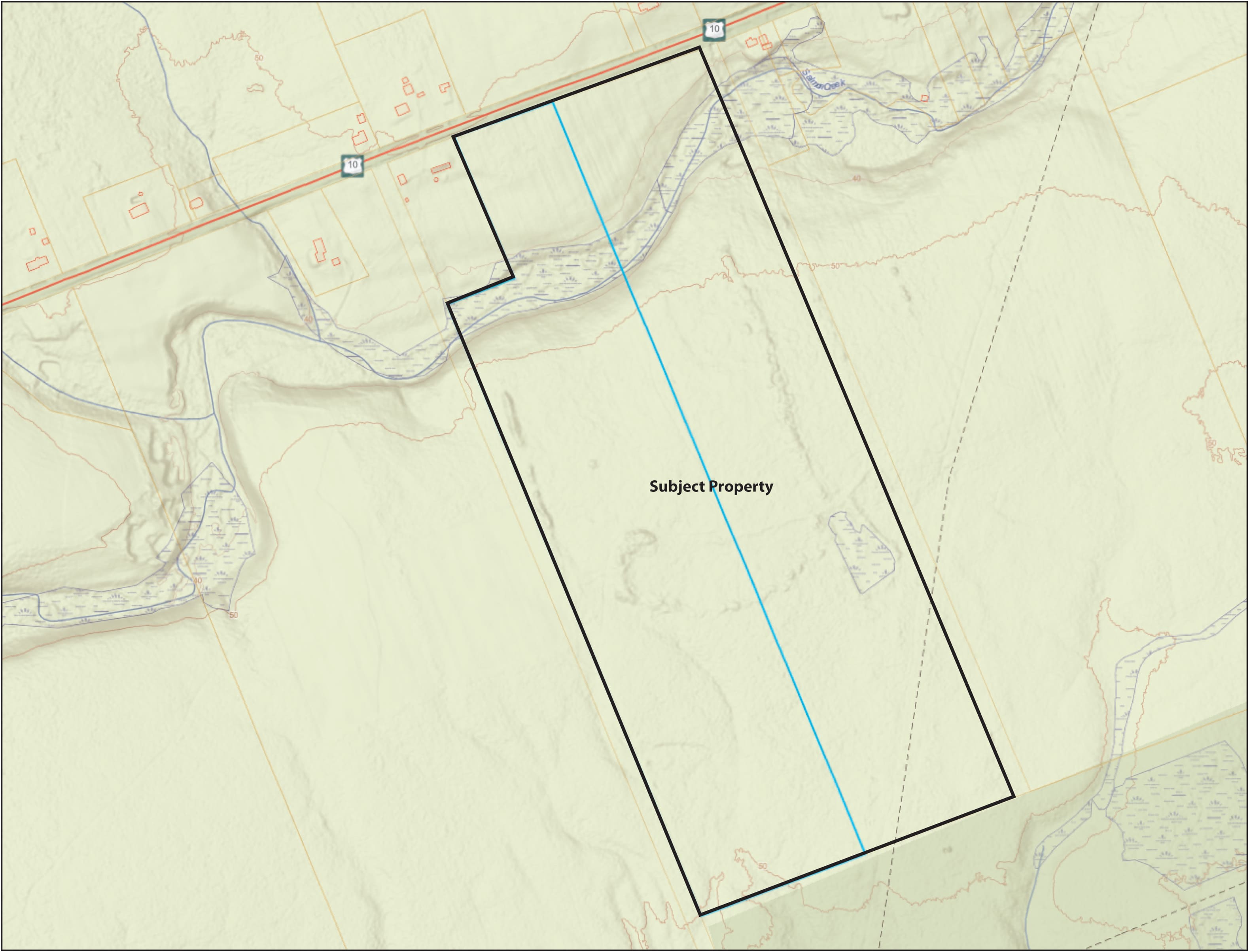 The property is almost entirely wooded except for a clear area of about 3.8 acres adjacent to the highway, and is without any dwellings or other structures. There is a dwelling immediately west of the property, and overall the area is moderately settled. There is also a dwelling immediately north of the property on the north side of the highway. The property is relatively flat and is crossed by Salmon Creek which flows within a wetland which occupies about 2 acres of the wooded part of the property. An electric power easement or right-of-way crosses the property diagonally near the south end.